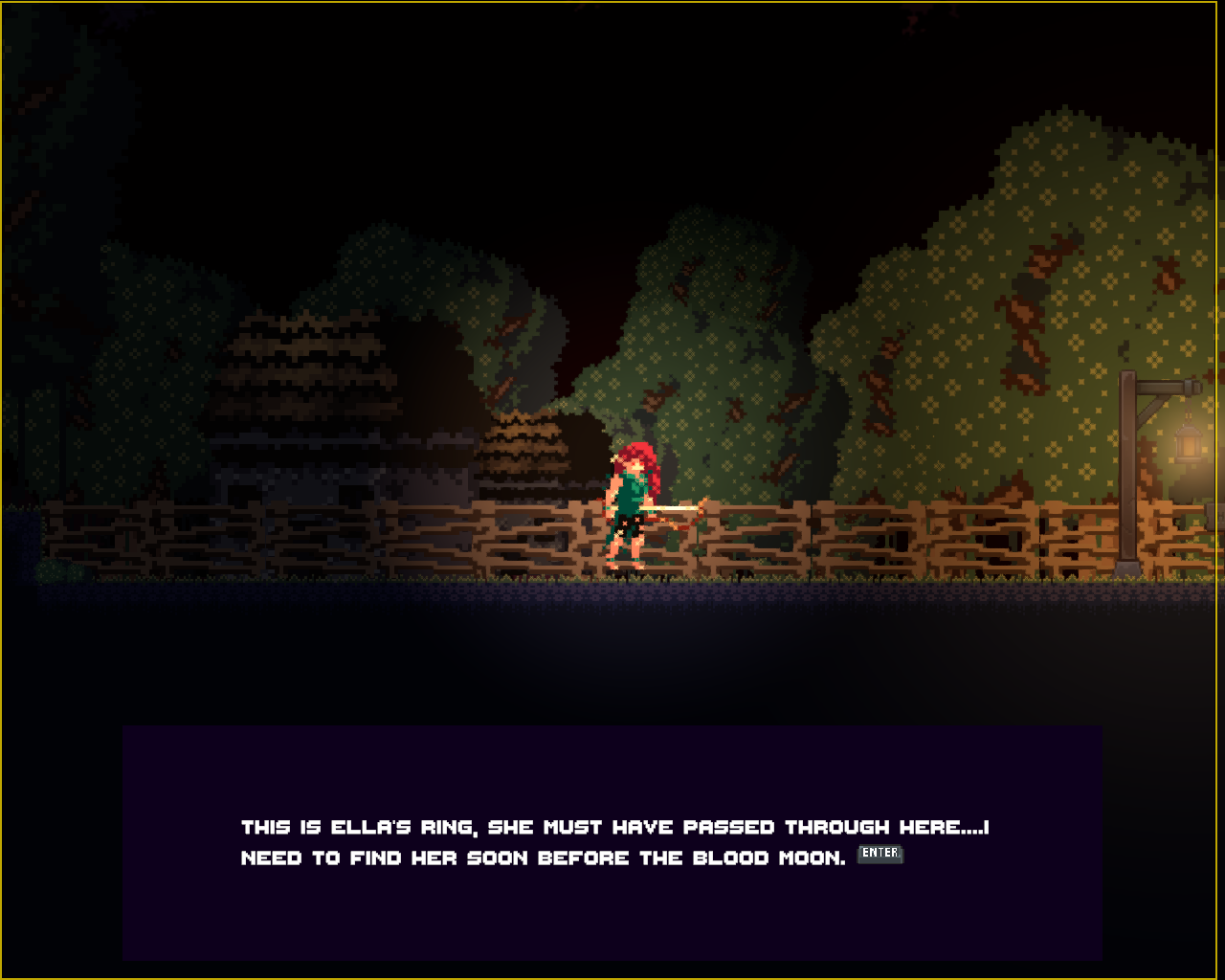 In Blood Moon you play as Una, a survivor trying to navigate a decaying forest filled with abandoned structures, hostile creatures, and cryptic NPCs. Your goal is to track down Ella, your missing sister, by gathering clues, completing item-based quests, and uncovering the mysteries hidden in the environment. As you progress, dialogue choices and item collection shape how the story unfolds.